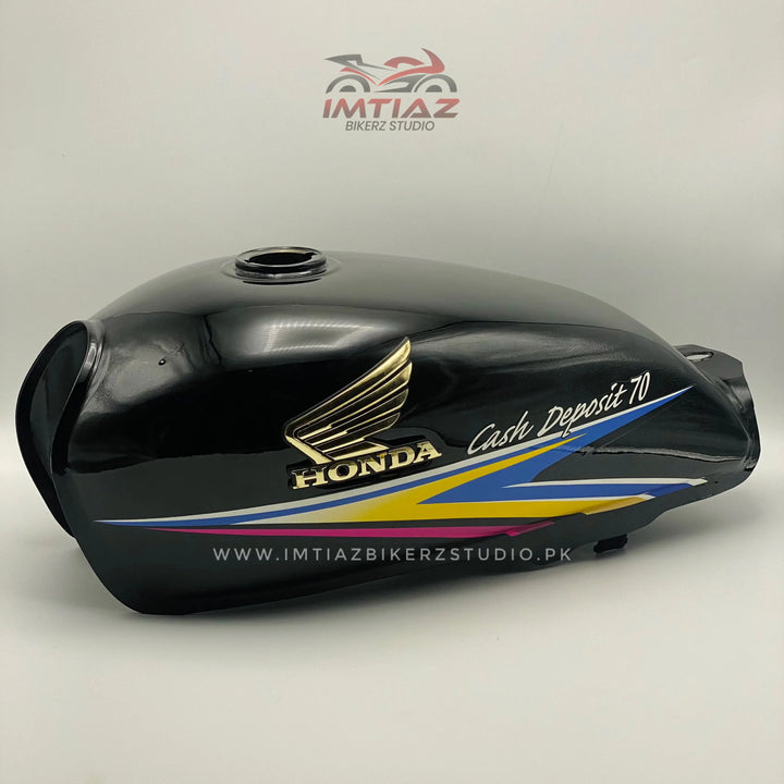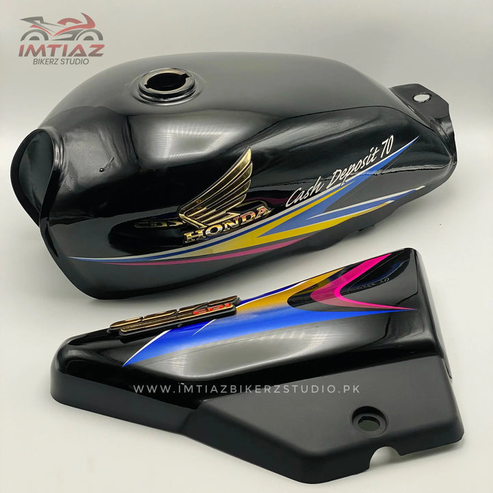 Authentic 2010 Black CD70 fuel tank paired with durable ABS side covers, specially customized for your motorcycle. These genuine components ensure perfect fitment while the sleek black finish adds a stylish touch to your bike's appearance. Designed to provide reliable performance and protection, enhancing both functionality and aesthetics for your CD70.
